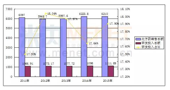從歷年統(tǒng)計數(shù)據(jù)看,2015年全球制藥50強企業(yè)處方藥銷售總額出現(xiàn)負增長,下降13.8億美元,從企業(yè)來看,處方藥銷售前9名的企業(yè)銷售收入全部負增長。研發(fā)投入繼續(xù)穩(wěn)步增長,突破1100億美元,跨國藥企對研發(fā)的重視程度并未削減。