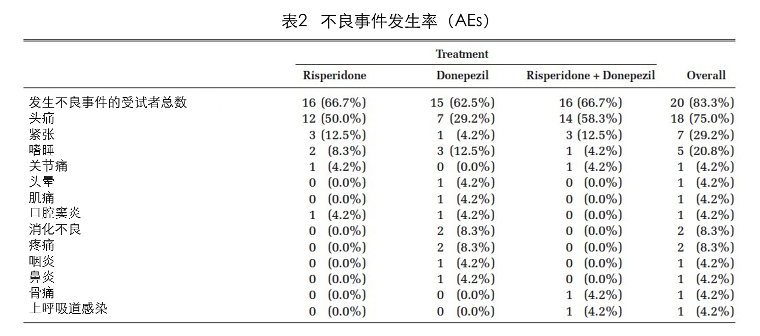 試驗期間沒有受試者中斷試驗,無死亡事件和嚴(yán)重不良事件,在實驗室檢查和心電圖檢查中也無臨床上的顯著變化。有20名受試者(83%)發(fā)生過至少一次不良事件,但沒有一例被認(rèn)為是危急的或嚴(yán)重的。在報告的所有13種不同的不良事件中,最常見的是頭痛、緊張和嗜睡(表2)。這些不良事件中的大部分都被認(rèn)為可能與研究藥物有關(guān),也可能無關(guān)。報告的不良事件中,有16例在利培酮、15例在多奈哌齊、6例在聯(lián)合用藥治療期間發(fā)生的。因此,利培酮和多奈哌齊聯(lián)合用藥治療并沒有增加不良事件。