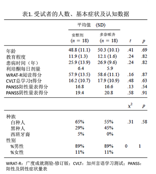 方法:選定36個精神分裂癥患者樣本,進行為期12周的多奈哌齊(5毫克和10毫克劑量)與利培酮聯(lián)合治療的雙盲安慰劑對照試驗。