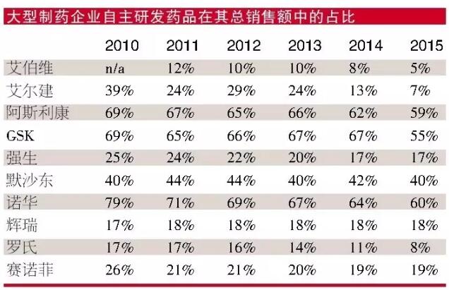 EvaluatePharma 2015年的數(shù)據(jù)分析表明,全球十大制藥企業(yè)中,有6家公司從自主研發(fā)藥品中獲得的銷售額還不及其總銷售額的20%。