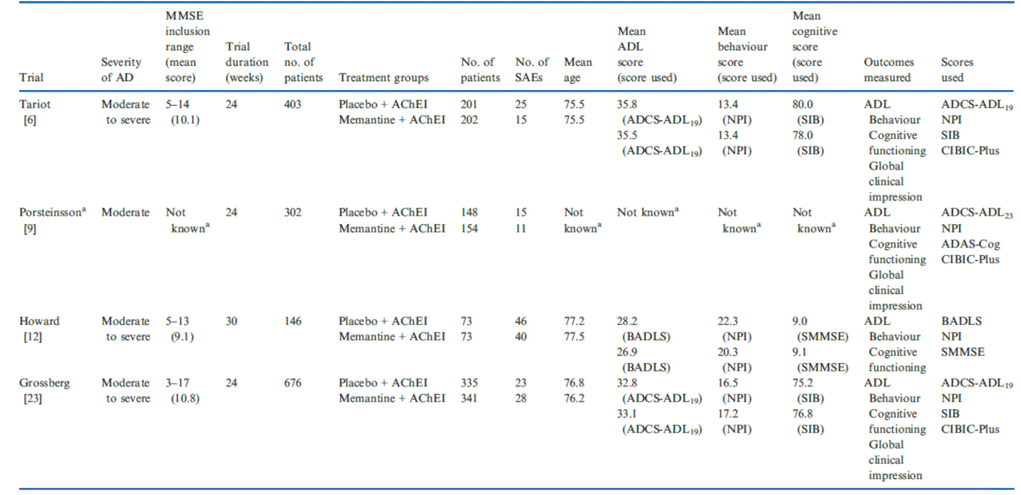AD,阿爾茨海默氏病; MMSE,簡易精神狀態(tài)檢查; SAE,嚴(yán)重不良事件; AChEI,乙酰膽堿酯酶抑制劑; ADL,日常生活活動(dòng); ADCS-ADL,阿爾茨海默氏病合作研究—日常生活活動(dòng);B ADLS,日常生活能力量表的布里斯托爾的活動(dòng); NPI,神經(jīng)精神庫存; SIB,嚴(yán)重?fù)p傷組; MMSE,標(biāo)準(zhǔn)化MMSE; ADAS-COG,阿爾茨海默病評(píng)定量表--認(rèn)知分量表。全球臨床效果分?jǐn)?shù)CIBIC-PLUS(臨床醫(yī)生的訪談為基礎(chǔ)的變化加保姆的印象輸入)是從基線的變化的量度,所以沒有給出基線分?jǐn)?shù),因?yàn)樗鼈兪遣贿m用的。分組的中度患者數(shù)據(jù)取自溫布萊德等人的薈萃分析 [28]分組中不出現(xiàn)基線特征。