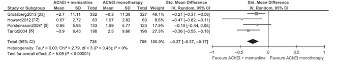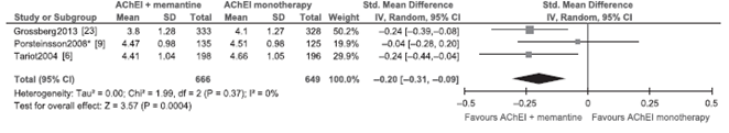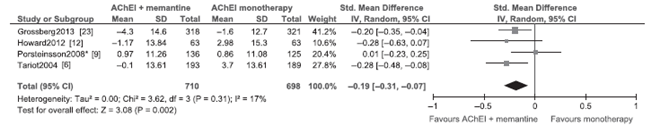圖4聯(lián)合膽堿酯酶抑制劑加美金剛的治療對比膽堿酯酶抑制劑單獨(dú)治療對認(rèn)知功能效果的薈萃分析結(jié)果(ADAS-齒輪和SIB)。*分組的中度患者數(shù)據(jù)取自溫布萊德等人的薈萃分析 [28]。 AChEI,乙酰膽堿酯酶抑制劑; ADAS-COG,阿爾茨海默病評(píng)定量表認(rèn)知分量表; SIB,嚴(yán)重?fù)p害電池;標(biāo)準(zhǔn),規(guī)范。