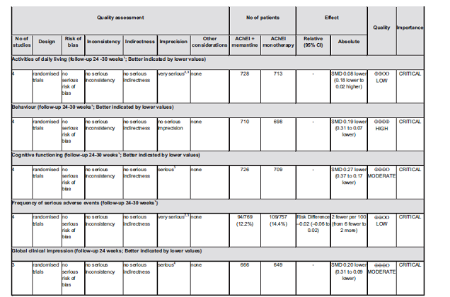 每個(gè)成果的起點(diǎn)水平高,但對ADL和不良事件卻降的很低,因?yàn)樗C萃分析置信區(qū)間包含正、負(fù)值和置信間隔是寬的(圖1和5)。對于認(rèn)知功能和GCI降至中度必須是由于效果估計(jì)嚴(yán)重的不精確性具有寬的置信區(qū)間。行為沒有了降級(jí)需要。