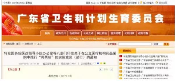 3月2日,廣東省衛(wèi)計委官網(wǎng)轉(zhuǎn)發(fā)《國務(wù)院醫(yī)改領(lǐng)導(dǎo)小組辦公室等八部門印發(fā)關(guān)于在公立醫(yī)療機(jī)構(gòu)藥品采購中推行“兩票制”的實(shí)施意見(試行)的通知》,這預(yù)示著,醫(yī)藥大省廣東啟動兩票制的步伐在加速。