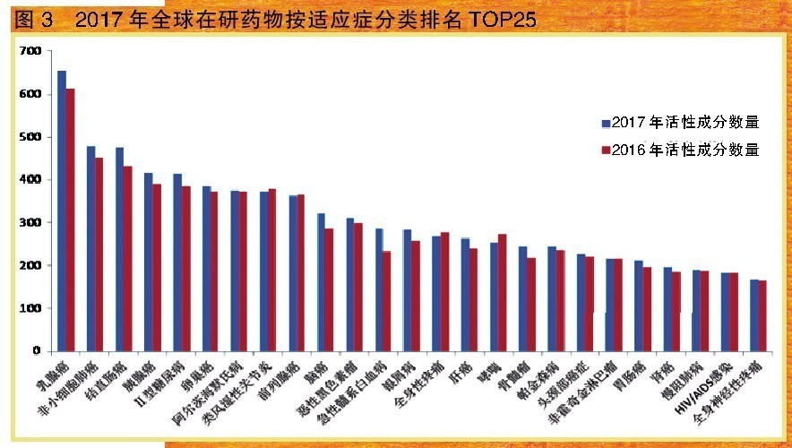從治療類別TOP 25排名中發(fā)現(xiàn),一般抗癌藥(在研藥物2231個(gè))、免疫類抗癌藥(2001個(gè))、抗感染預(yù)防性疫苗(848個(gè))、糖尿病治療藥物(624個(gè))、其他眼科用藥(615個(gè))為排名居前五位的治療類別,該排名順序與2015和2016年順序一致。