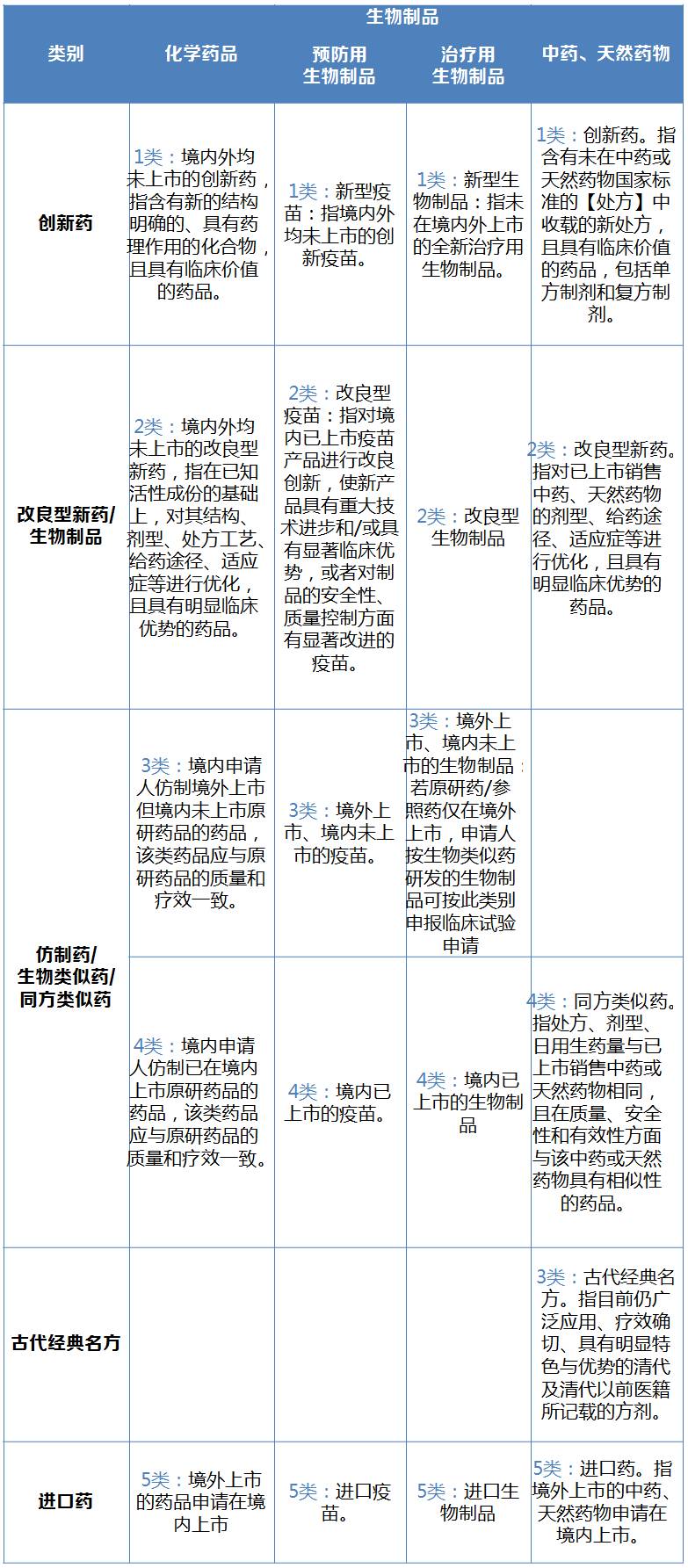 《藥品注冊管理辦法(修訂稿)》公布了最新的生物制品和中藥、天然藥物的分類,分類方法與此前公布的化學(xué)藥品分類方法基本相似,以創(chuàng)新藥、改良藥和仿制藥進(jìn)行分類,中藥、天然藥物單獨(dú)設(shè)定了個新3類古代經(jīng)典名方。生物制品分為預(yù)防用生物制品和治療用生物制品。