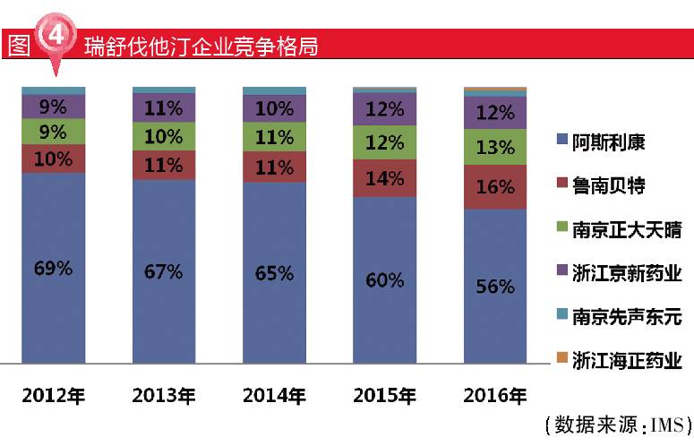 他汀類是治療高膽固醇血癥的首選藥物,瑞舒伐他汀鈣對肝臟具有高選擇性,降脂效果明顯,同時對中樞神經(jīng)的副作用較其他他汀顯著減小,被譽(yù)為“超級他汀”。據(jù)IMS數(shù)據(jù)統(tǒng)計,2016年全國瑞舒伐他汀市場規(guī)模約28億元,阿斯利康市場份額不斷在萎縮,2016年占比56%,魯南貝特占比16%、京新藥業(yè)占比12%、正大天晴占比13%。