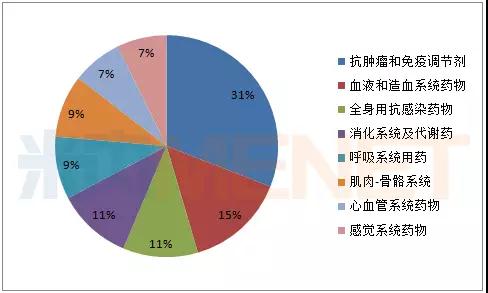 從治療類別上看,入選的產(chǎn)品涵蓋多個類別,其中抗腫瘤與免疫調(diào)節(jié)劑以31%的比例位居首位,血液與造血系統(tǒng)藥物以15%的比例緊接其后,全身抗感染藥物、消化系統(tǒng)及代謝藥以11%的比例并列第三,這四類藥物占據(jù)所有治療類別接近60%的比例。