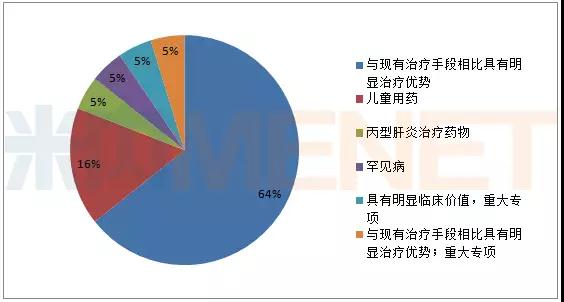 從56個申請“新藥上市”的產(chǎn)品入選優(yōu)先審評的原因看,“與現(xiàn)有治療手段相比具有明顯治療優(yōu)勢”是主要入選原因,占據(jù)64%的比例,“兒童用藥”以16%的比例緊接其后,“丙型肝炎治療藥物”、“罕見病”等以5%的比例并排第三。可見CDE在選擇優(yōu)先審評產(chǎn)品時,“偏愛”具有明顯臨床優(yōu)勢,以及丙肝、兒童用藥、罕見病等臨床較為欠缺的產(chǎn)品,這也為藥企研發(fā)新藥提供了一定的方向指引。