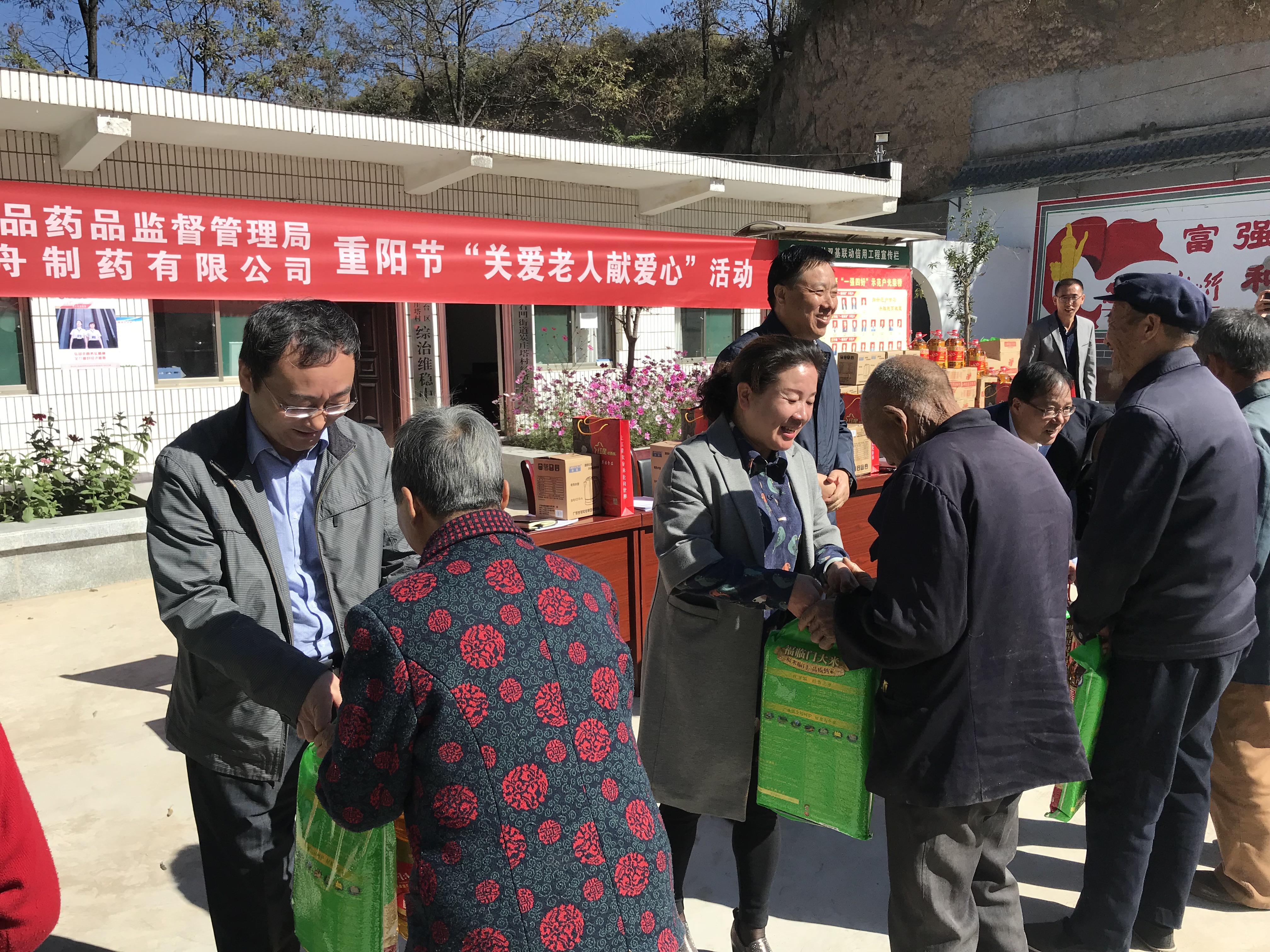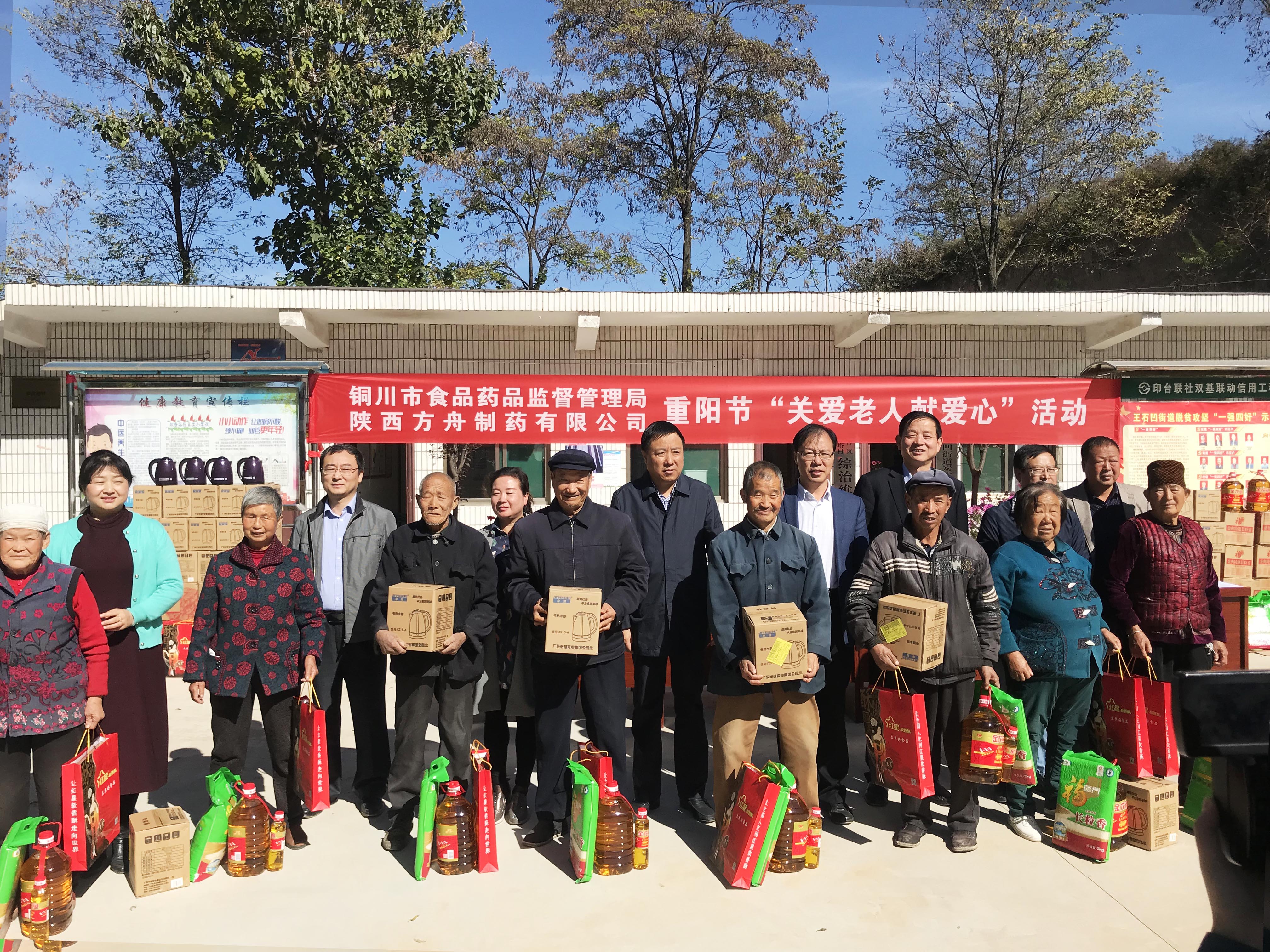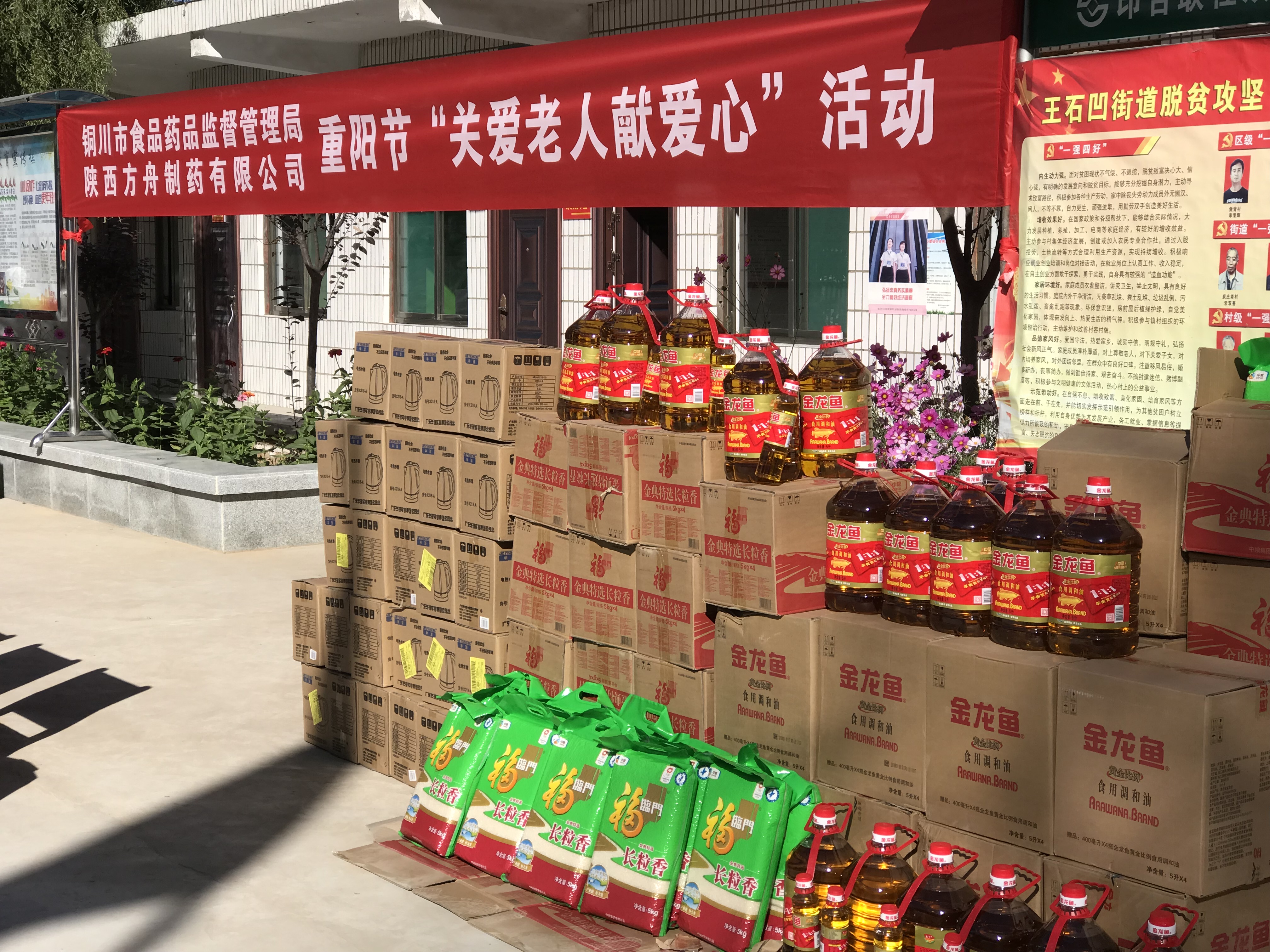 2018年10月9日,秋風送爽,瓜果飄香,在“九九”重陽節(jié)即將到來之際,為發(fā)揚尊老、愛老、敬老的優(yōu)良傳統(tǒng),銅川市食品藥品監(jiān)督管理局和陜西方舟制藥有限公司在銅川印臺區(qū)王石凹街道炭莊塔村聯(lián)合舉辦了“重陽節(jié)關愛老人獻愛心活動”,為65歲以上的老人及貧困戶發(fā)放了米、油、熱水壺、糕點等慰問品。