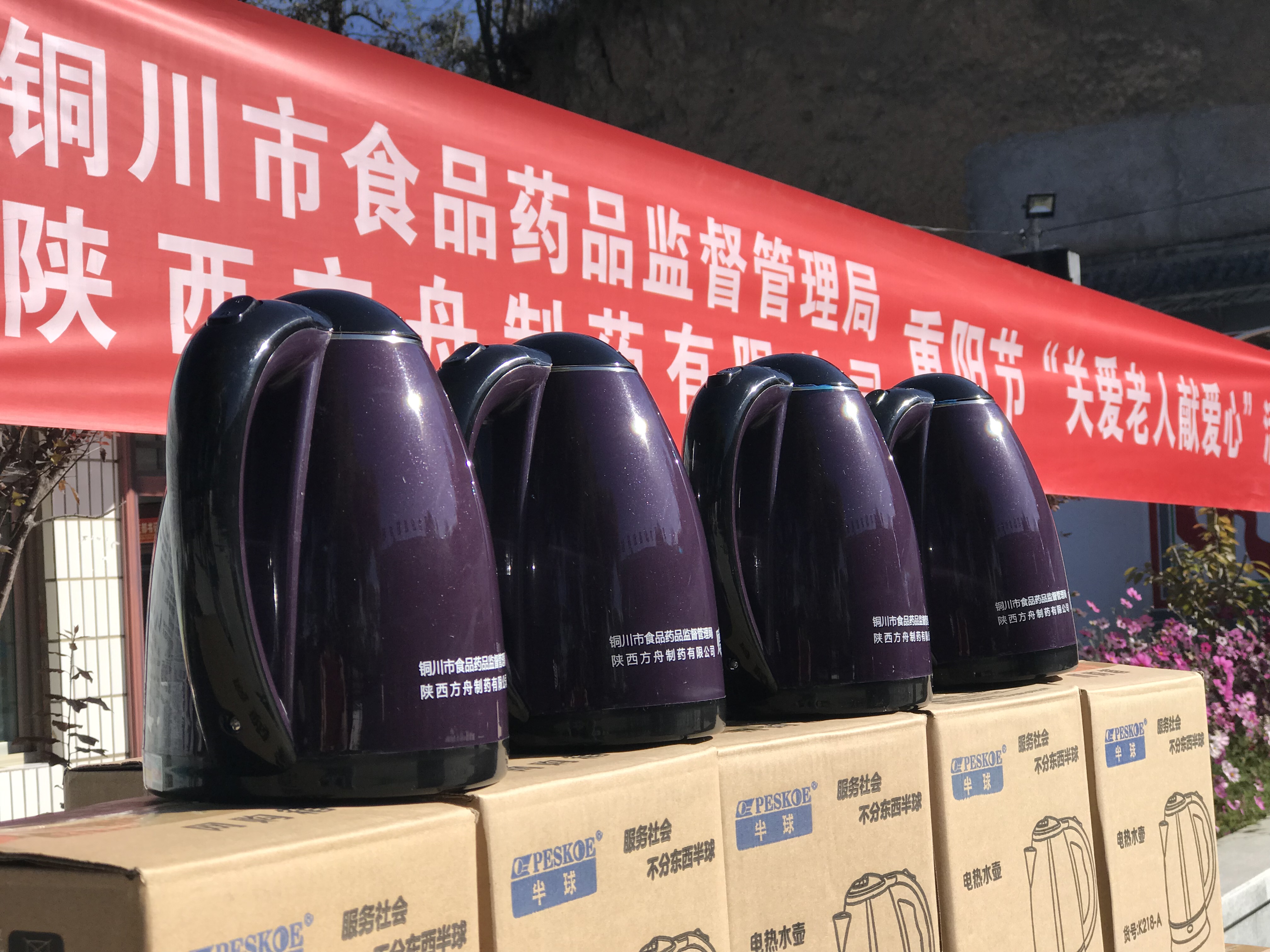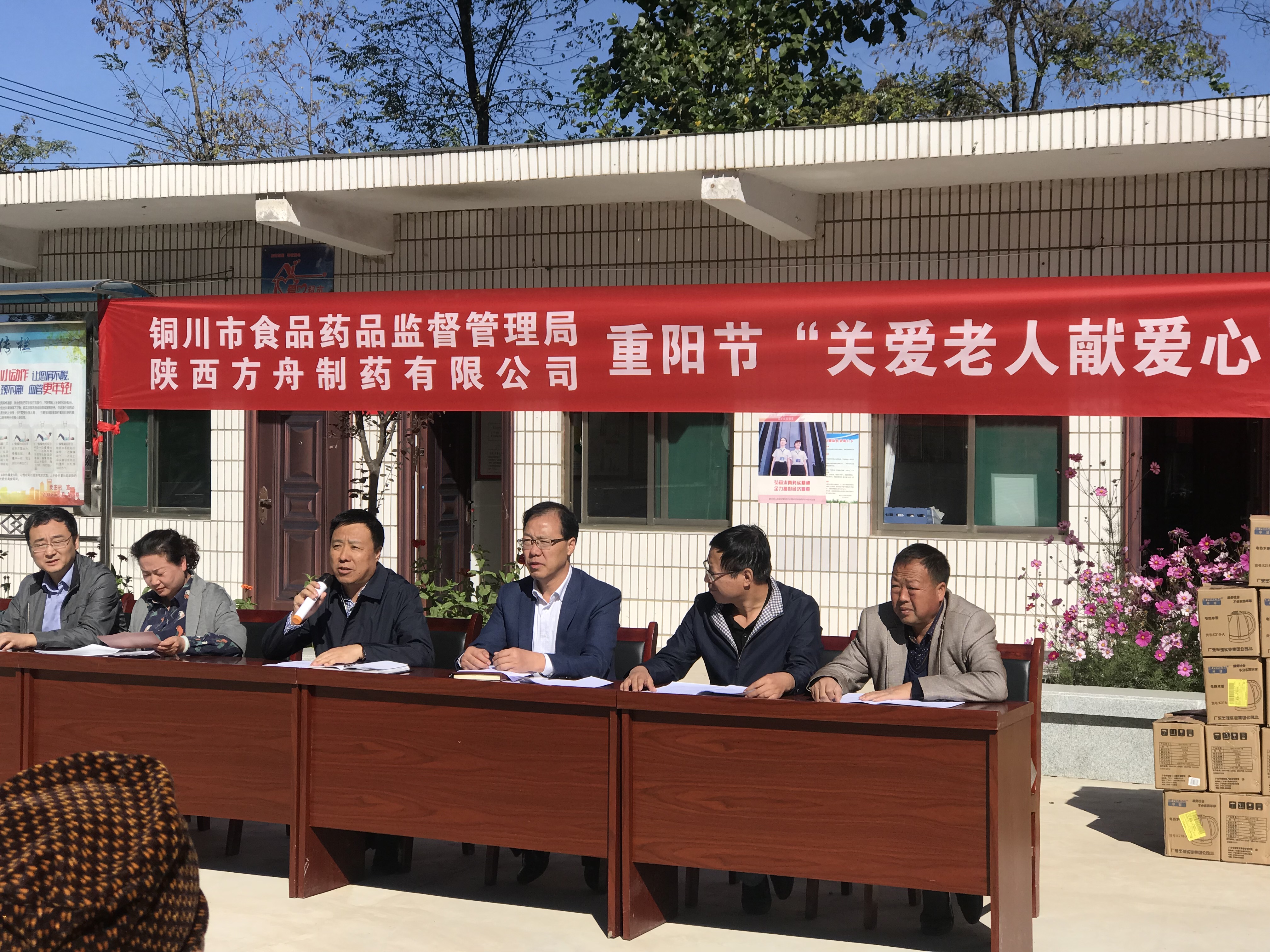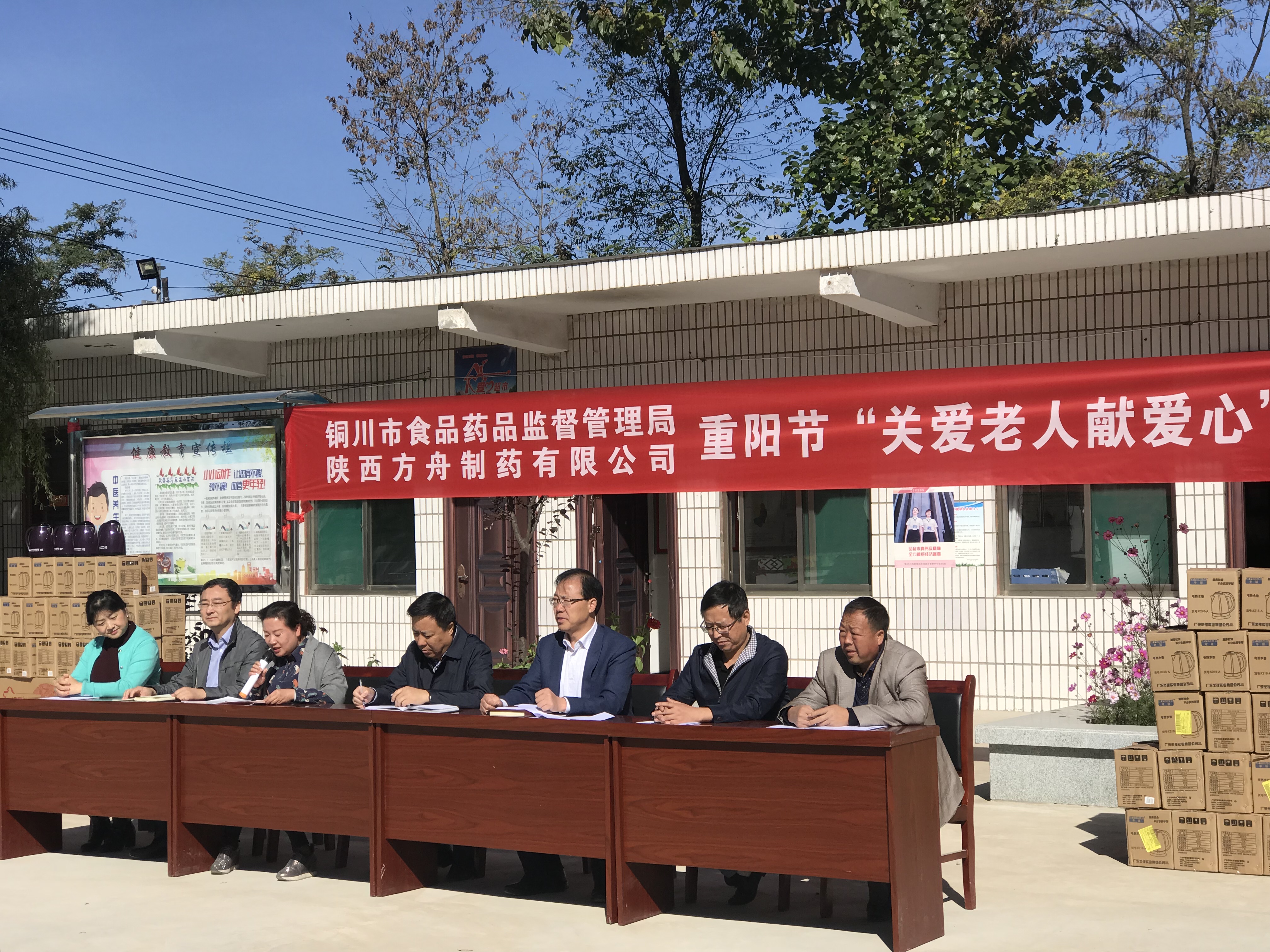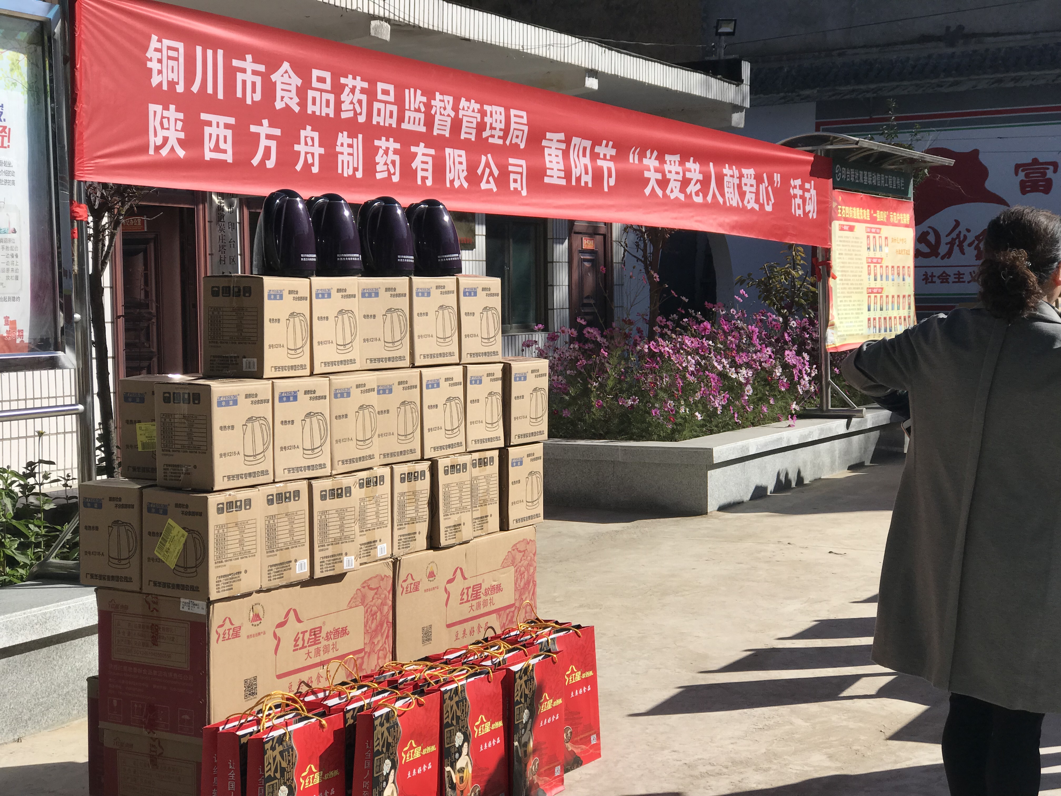 2018年10月9日,秋風送爽,瓜果飄香,在“九九”重陽節(jié)即將到來之際,為發(fā)揚尊老、愛老、敬老的優(yōu)良傳統(tǒng),銅川市食品藥品監(jiān)督管理局和陜西方舟制藥有限公司在銅川印臺區(qū)王石凹街道炭莊塔村聯(lián)合舉辦了“重陽節(jié)關愛老人獻愛心活動”,為65歲以上的老人及貧困戶發(fā)放了米、油、熱水壺、糕點等慰問品。