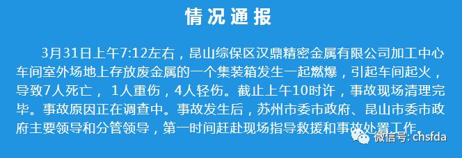 據(jù)昆山發(fā)布消息,3月31日上午7時(shí)12分左右,江蘇昆山綜保區(qū)漢鼎精密金屬有限公司加工中心車間室外場(chǎng)地上存放廢金屬的一個(gè)集裝箱發(fā)生一起燃爆,引起車間起火,導(dǎo)致7人死亡,1人重傷,4人輕傷。事故原因正在調(diào)查。