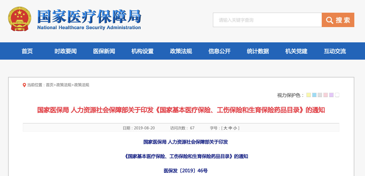剛剛,國家醫(yī)保局官網發(fā)布《國家基本醫(yī)療保險、工傷保險和生育保險藥品目錄》,公布了2019年版國家基本醫(yī)療保險、工傷保險和生育保險藥品目錄。