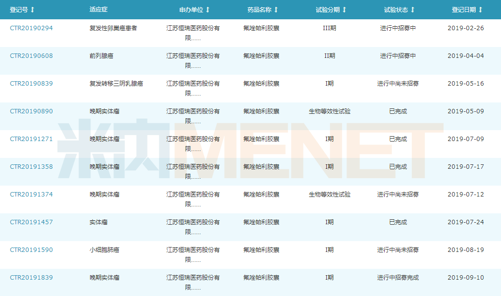 據(jù)米內(nèi)網(wǎng)中國(guó)藥品臨床試驗(yàn)公示庫(kù),目前恒瑞醫(yī)藥的氟唑帕利膠囊已開(kāi)展了10項(xiàng)臨床,適應(yīng)癥涉及復(fù)發(fā)性卵巢癌患者、前列腺癌、復(fù)發(fā)轉(zhuǎn)移三陰乳腺癌、晚期實(shí)體瘤、實(shí)體瘤、小細(xì)胞肺癌等。其中,復(fù)發(fā)性卵巢癌患者適應(yīng)癥已開(kāi)展至臨床III期。
