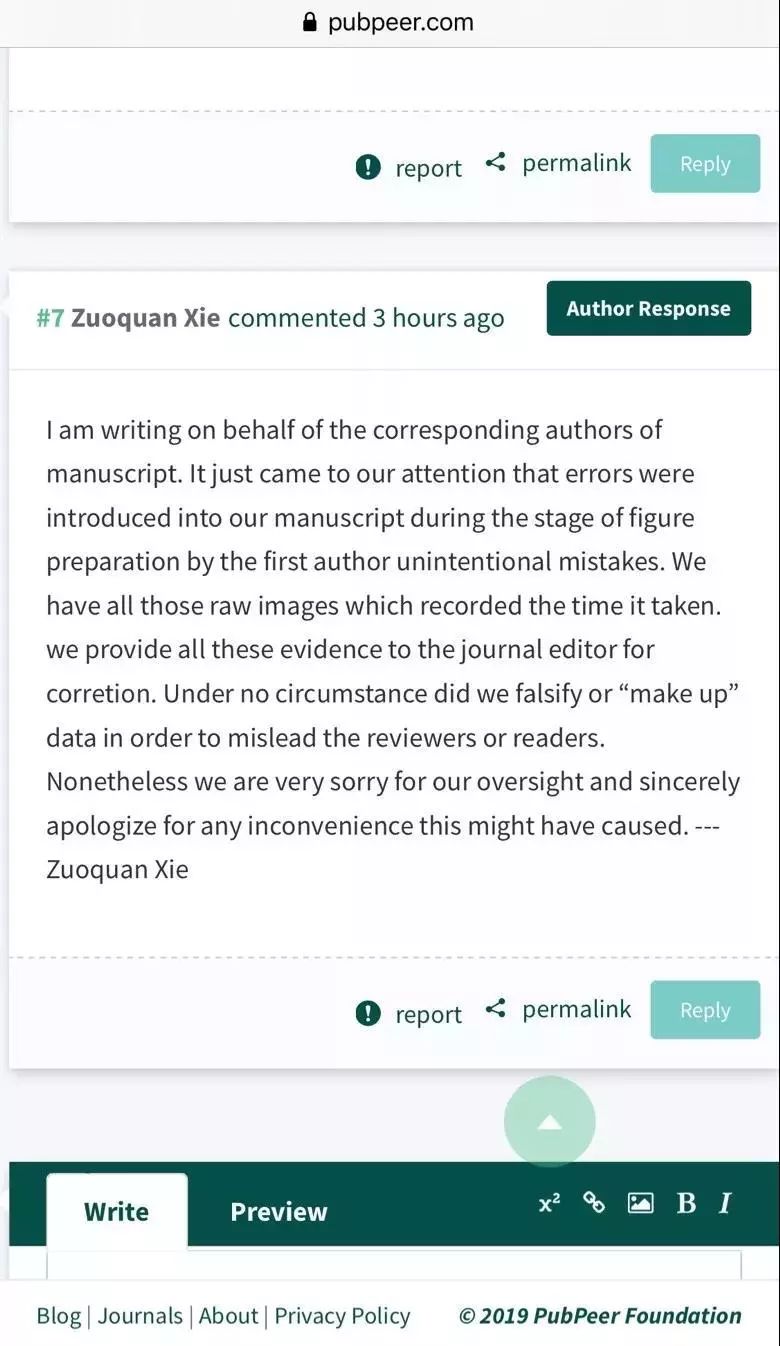 11月6日,謝作權(quán)在PubPeer上進(jìn)行回復(fù)到,“我們剛剛注意到,這些錯(cuò)誤是第一作者在原稿中準(zhǔn)備圖片時(shí)不小心犯的。我們有照片拍攝時(shí)所有的原始資料。我們已經(jīng)把這些證據(jù)提供給了期刊編輯來修正。我們絕對不可能偽造或者‘編造’實(shí)驗(yàn)數(shù)據(jù)來誤導(dǎo)評審和讀者。但是對于我們的疏忽,我們還是很抱歉,并誠摯地為帶來的麻煩道歉”。
