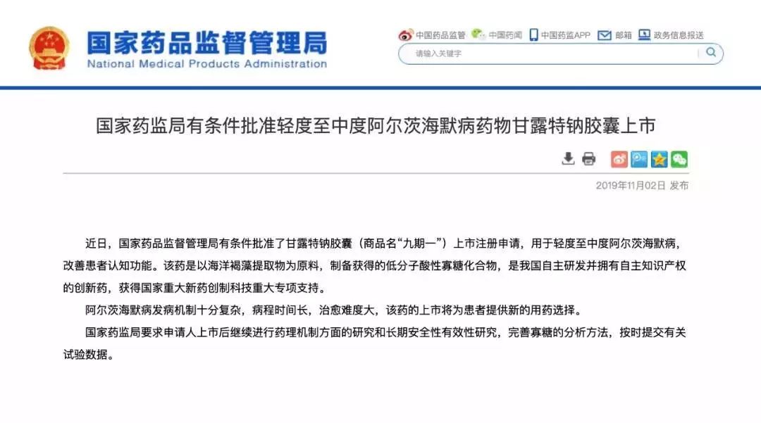 11月2日,國家藥監(jiān)局官網(wǎng)發(fā)布消息,有條件批準(zhǔn)甘露特納膠囊(商品名“九期一”,GV-971)上市注冊申請。該藥品由中國海洋大學(xué)、上海藥物研究所和上海綠谷制藥歷時(shí)22年共同研制、開發(fā),用于治療輕度至中度阿爾茨海默癥,改善患者認(rèn)知功能。