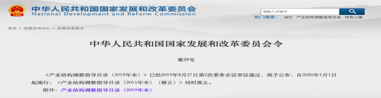 發(fā)改委發(fā)布第29號令——根據(jù)第29號令,《產(chǎn)業(yè)結(jié)構(gòu)調(diào)整指導(dǎo)目錄(2019年本)》將自2020年1月1日起施行,同時(2011年本)(修正)》廢止。