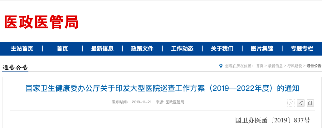 近日,國(guó)家衛(wèi)健委印發(fā)《大型醫(yī)院巡查工作方案(2019—2022年度)》。