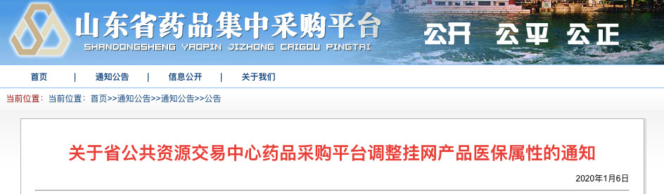 通知顯示,自2020年1月1日起,山東省基本醫(yī)療保險(xiǎn)、工傷保險(xiǎn)和生育保險(xiǎn)統(tǒng)一執(zhí)行新版《國家基本醫(yī)療保險(xiǎn)、工傷保險(xiǎn)和生育保險(xiǎn)藥品目錄》,省公共資源交易中心藥品采購平臺掛網(wǎng)產(chǎn)品醫(yī)保屬性已調(diào)整結(jié)束。