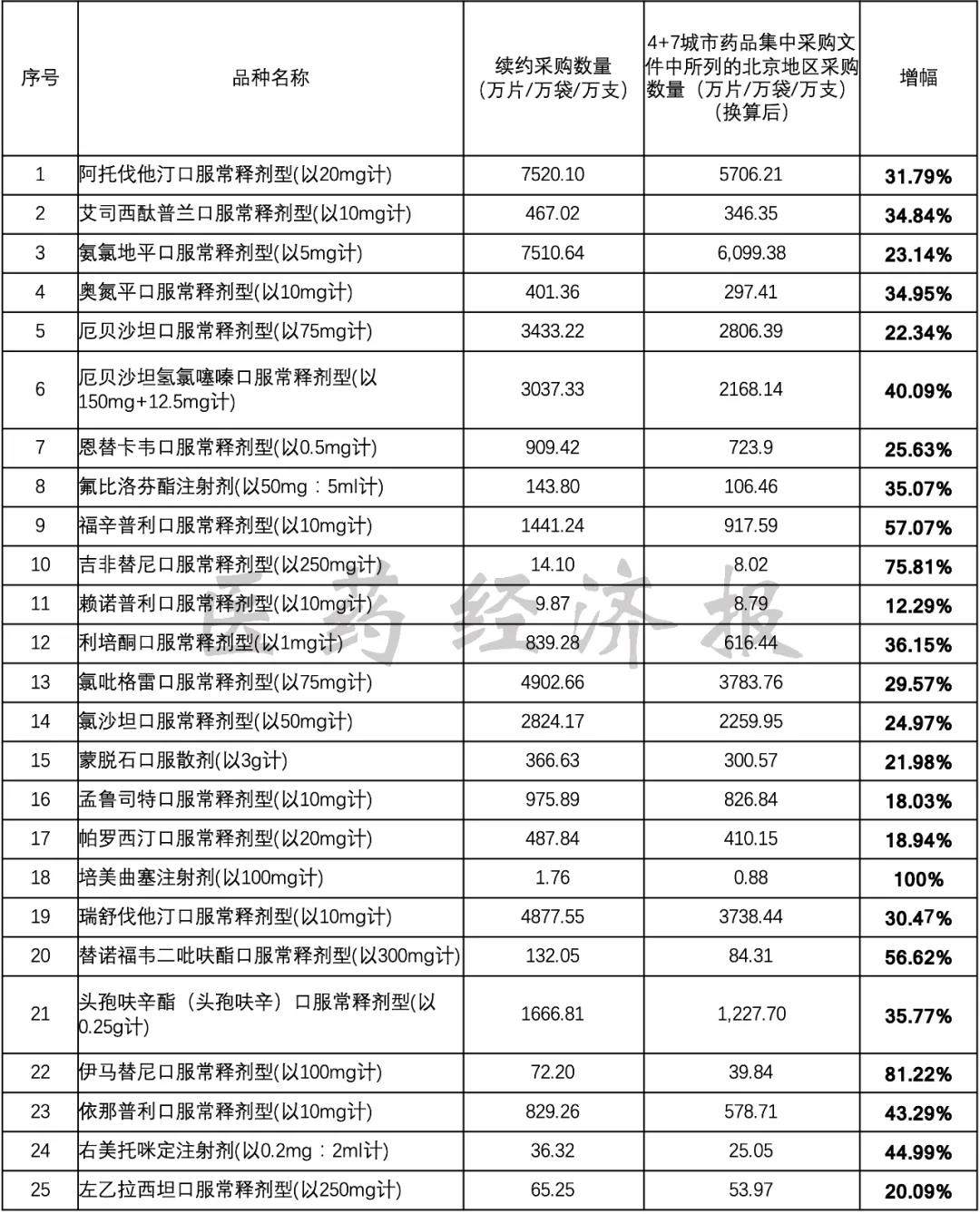 對(duì)于續(xù)約任務(wù)量,北京表示,續(xù)約年采購任務(wù)量原則上不低于首年任務(wù)量,并參照歷史用量和增長率制定。根據(jù)北京發(fā)布的續(xù)約品種任務(wù)量列表,并對(duì)比“4+7”城市藥品集中采購文件中所列的北京地區(qū)采購數(shù)量,經(jīng)過換算至統(tǒng)一規(guī)格,結(jié)果顯示:25個(gè)品種均實(shí)現(xiàn)了采購量的增長。整體來看,增幅在20%~50%區(qū)間的品種最多,共有17個(gè)品種,包括阿托伐他汀口服常釋劑型、氨氯地平口服常釋劑型、恩替卡韋口服常釋劑型等;增幅小于20%的有3個(gè),分別為賴諾普利口服常釋劑型(增幅12.29%)、孟魯司特口服常釋劑型(增幅18.03%)、帕羅西汀口服常釋劑型(18.94%)。